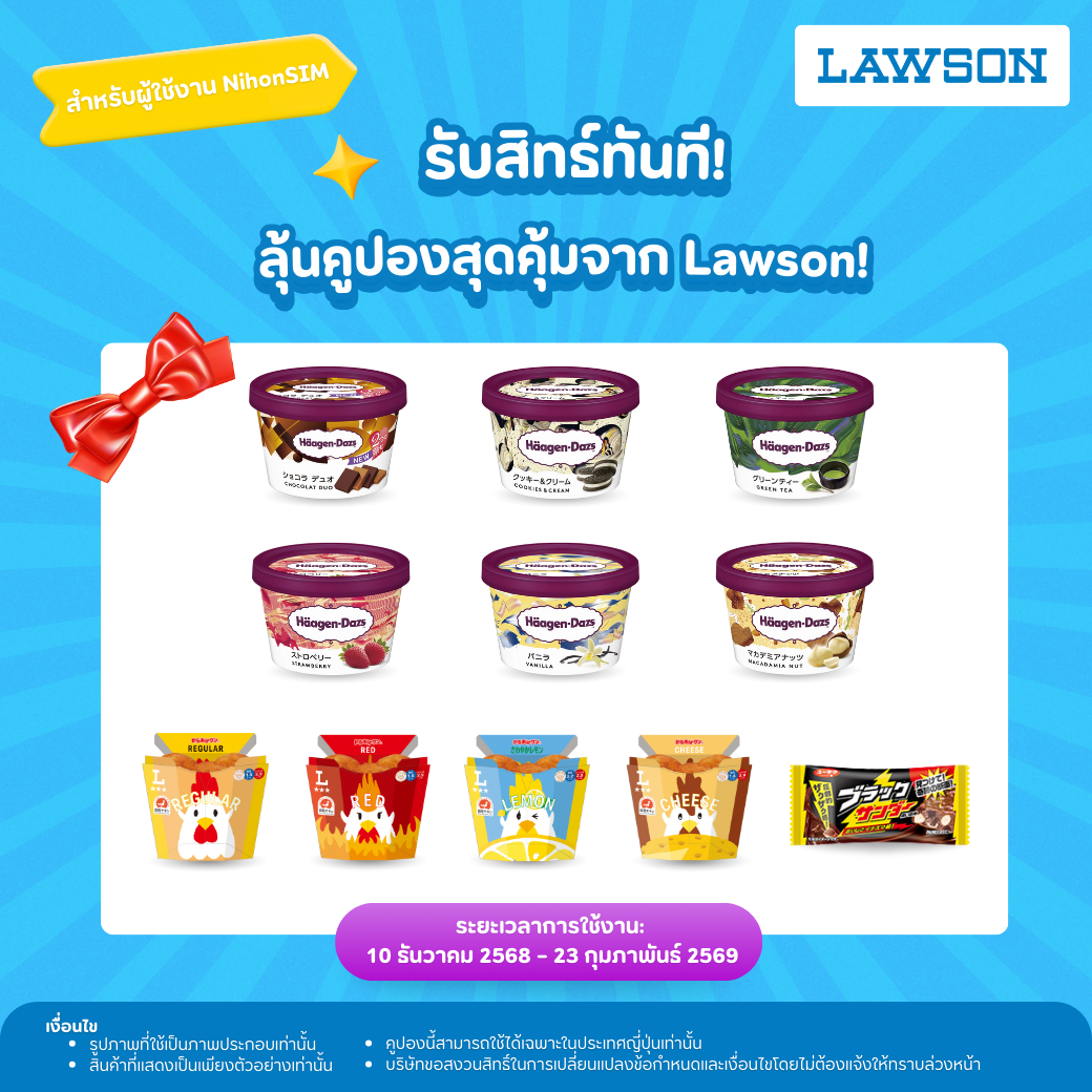 ผู้ที่ซื้อ NihonSIM จะได้รับคูปอง Lucky Draw ของร้าน Lawson โดยคูปองนี้สามารถนำไปแลกสินค้ายอดนิยมได้ที่ร้านสะดวกซื้อ Lawson ในประเทศญี่ปุ่น!
