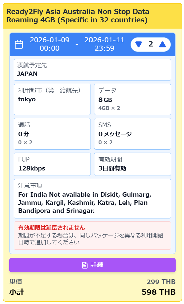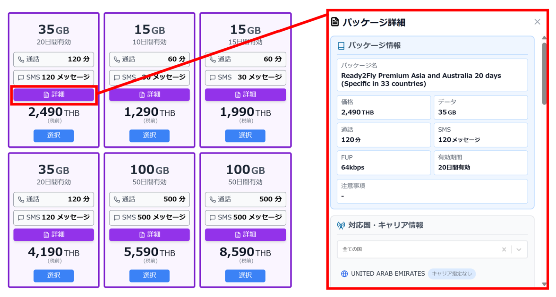 「詳細ボタン」を押すとパッケージ毎の注意点や各国の指定キャリアが表示されます。