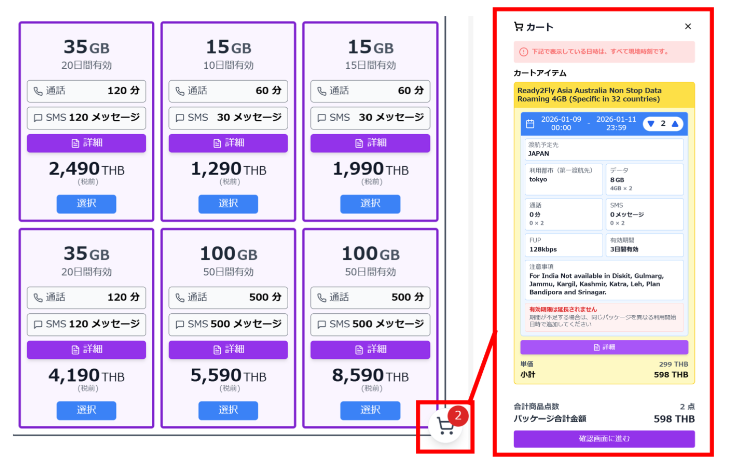 แพ็คเกจที่เลือกจะถูกบันทึกไว้ใน “ตะกร้าสินค้า” ที่มุมขวาล่างของหน้าจอชั่วคราว