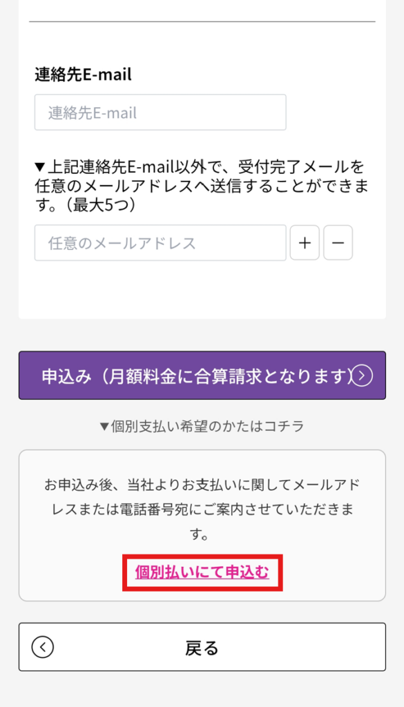 ローミング料金を月額請求とは別でお支払い希望の場合は、完了画面下部の専用ページリンクからお進みください。