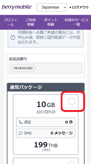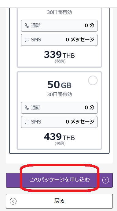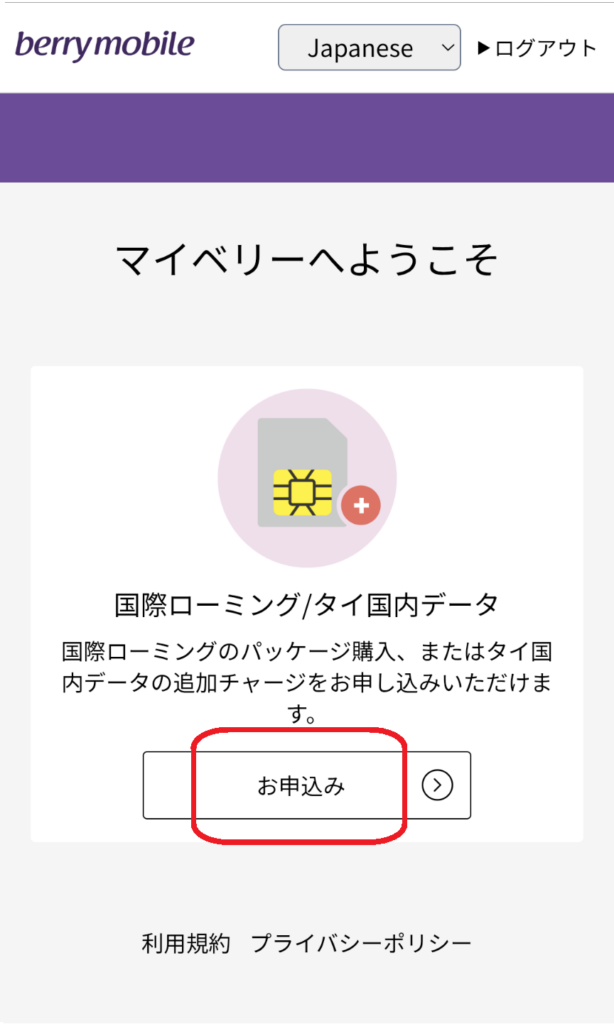 STEP4:「国際ローミング/タイ国内データ」→「お申込み」を選択